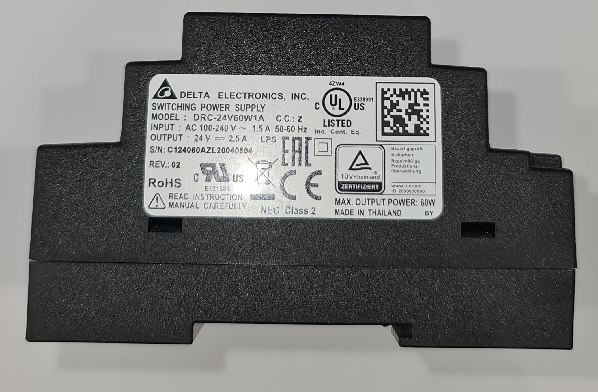 Auf der TS35/7.5 oder 15 DIN Schiene installiertes Impulsnetzteil, beständig gegen hohe Arbeitstemperaturen (bis zu 70°C).