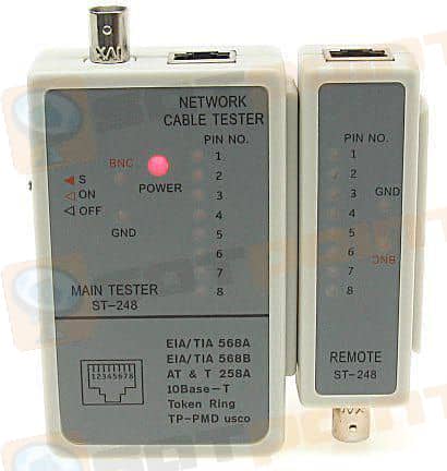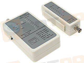 Der testet die Richtigkeit der Installation, der Reihenfolge im RJ-45 Stecker sowie ob ein Signal zwischen den beiden Enden des konzentrischen Kabels mit BNC Steckern verläuft. Der Test kann mit zwei Geschwindigkeiten stattfinden. Der Tester kann auf einer Seite des Kabels gelassen werden, man kann hingegen die Fernbedienung am anderen Ende anschließen und die Messung durchführen. Das Gerät ist aus beständigem Kunststoff hergestellt, was sich hervorragend für Installateursarbeiten eignet und einen langjährigen, funktionierenden Betrieb garantiert.