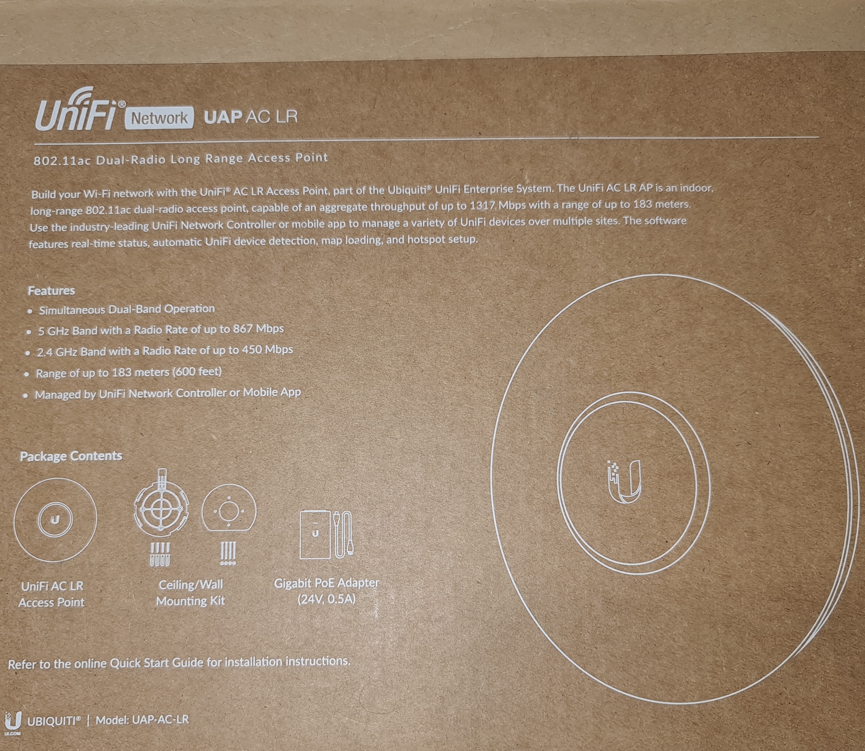 Ubiquiti Networks UAP-AC-LR. Maximale Datenübertragungsrate: 1000 Mbit/s, Maximale Datenübertragungsrate (5 GHz): 867 Mbit/s, Ethernet LAN Datentransferraten: 10,100,1000 Mbit/s. Unterstützte Sicherheitsalgorithmen: AES,TKIP,WEP,WPA,WPA-PSK,WPA2. Eingangsspannung: 24 V, Eingangsstrom: 0.5 A, Stromverbrauch (max.): 6,5 W. Produktfarbe: Weiß, Zertifizierung: CE, FCC, IC. Antenne Zunahmeniveau (max): 3 dBi