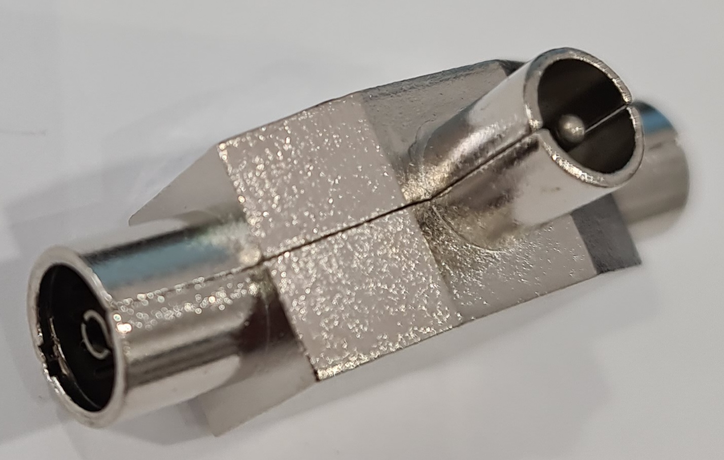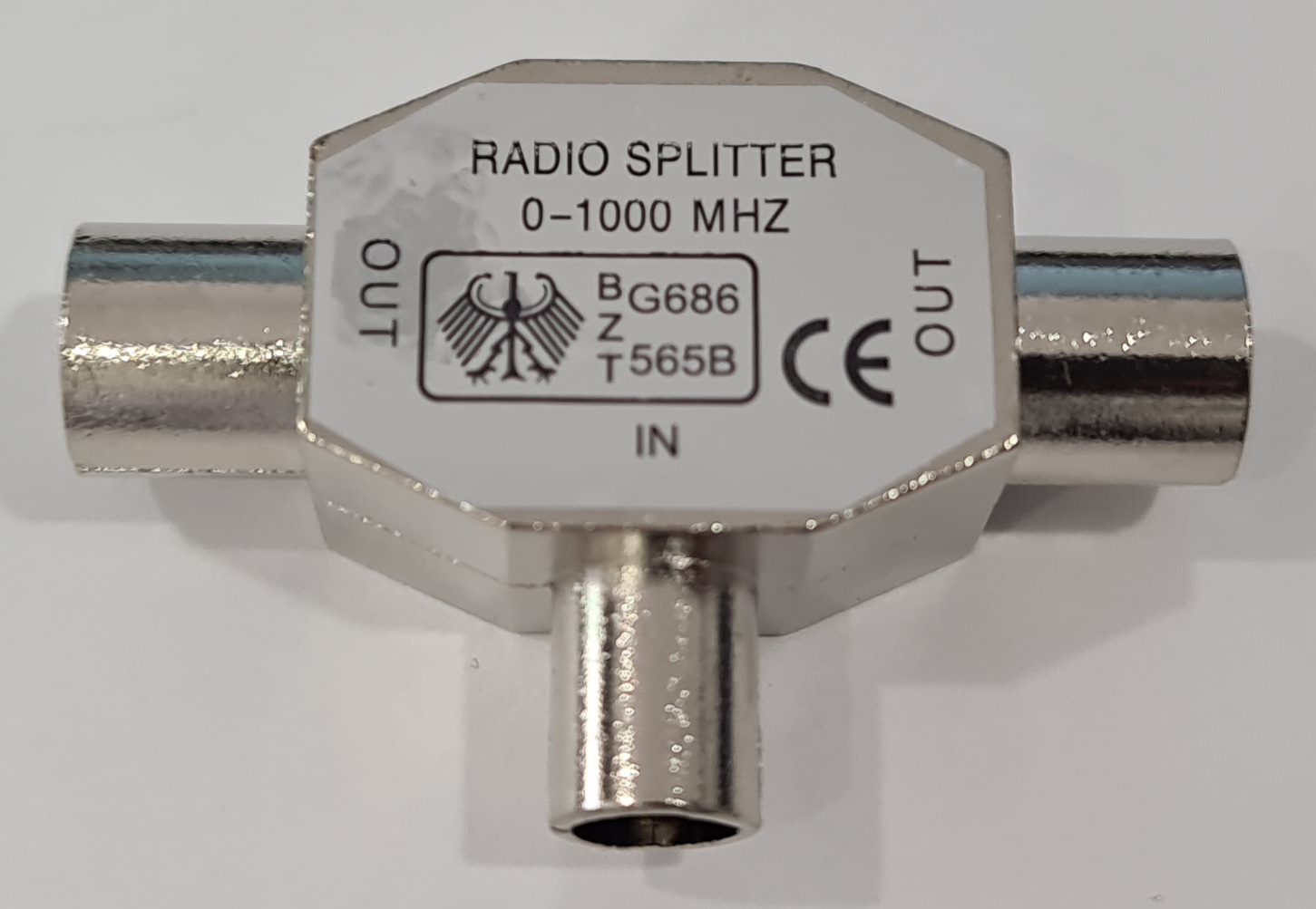 Normaler Antennensplitter für einfache Radio- oder TV-Installationen. Der Adapter wird z. B. in einer Radiosteckdose verwendet, wo das Signal für 2 Radios benötigt wird. 0-1000MHZ