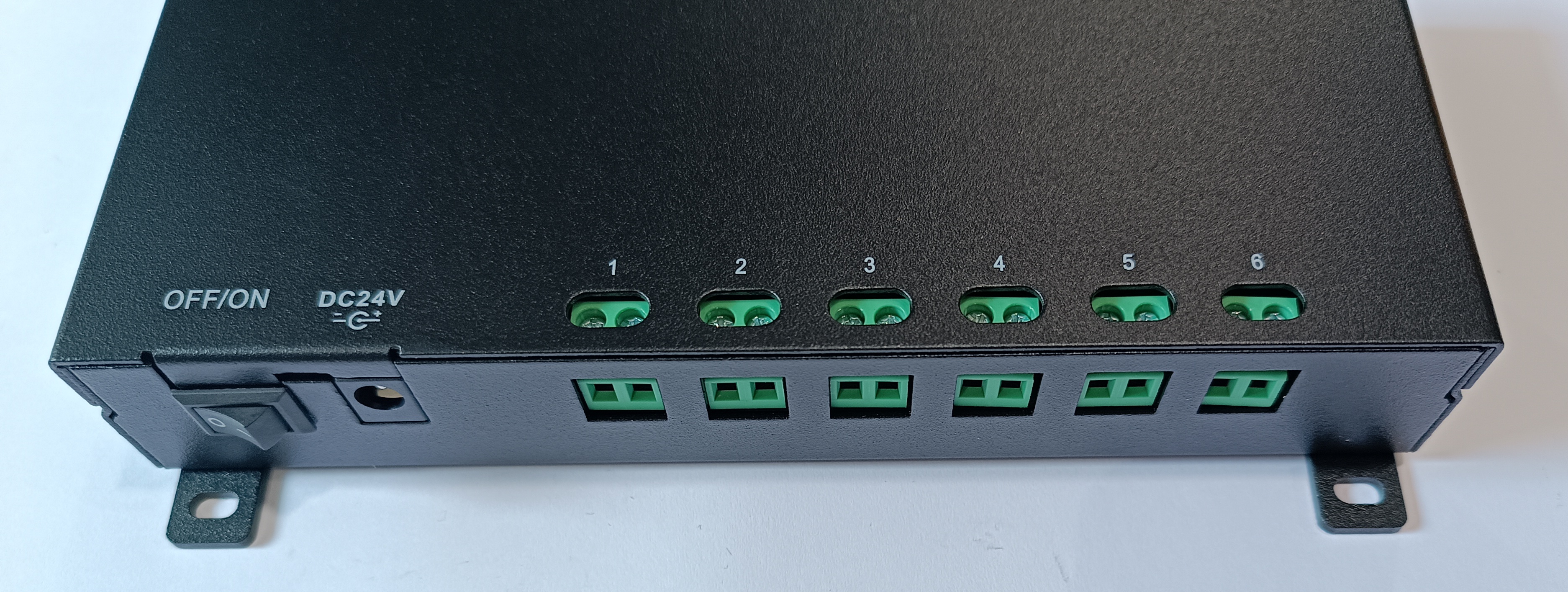 Das Gerät besitzt 6 Magistralen mit 2 Leitungen, für den Anschluss von Monitoren und externen Panels (Stromversorgung und Signalübertragung) sowie 1 Ethernet-Buchse zum Anschluss des LAN Netzwerks. Darüber hinaus ist der Switch mit zusätzlichen Ausgängen der 2-Leiter-Magistrale verbunden, die zur Kaskaden-Verbindung von maximal 30 solchen Geräten dienen. Dies ermöglicht den Anschluss von bis zu 180 internen Panels oder Video-Gegensprechanlagen im Rahmen einer Installation.